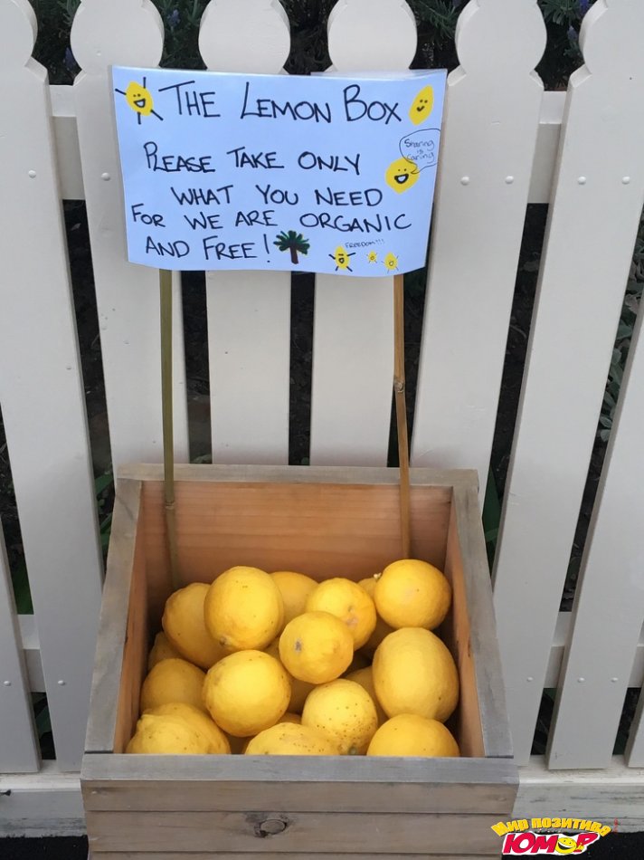 15. «Мое лимонное дерево так расплодилось в последнее время, что я решил повесить на заборе маленькую коробочку с лимонами для прохожих»