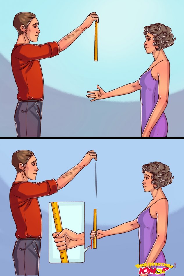Ассистент командует: «Внимание!» — и отпускает линейку. Ваша задача — схватить ее как можно быстрее. Вычисляется расстояние от нулевой отметки до нижнего края ладони. Тест проводится трижды, чтобы выявить наилучший результат. Нормы рассчитаны в зависимости от пола и возраста. Например, хорошей реакцией 25-летней девушки является захват линейки на уровне 17 см.