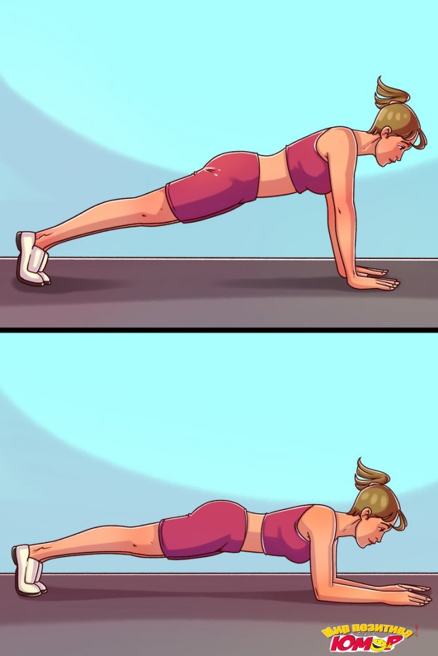Универсальное упражнение для мышц всего тела является еще и индикатором вашей тренированности. Главное условие — выполнять планку правильно. Вам нужно встать на четвереньки и распределить вес между ногами и руками, напрячь мышцы пресса и ягодиц и не допускать провисания живота или выпячивания спины. Выполнять упражнение нужно, опираясь на ладони или локти. Постепенно его можно усложнять, вытягивая руку или ногу.