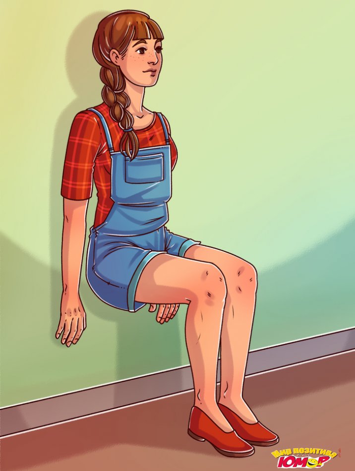 Прислонитесь спиной к стене и попытайтесь сесть, как на стульчик, чтобы бедра были параллельны полу. Если вы можете продержаться в этой позе более минуты — поздравляем, вы в отличной физической форме. Если «просидели» на «стульчике» меньше, добавьте в вашу тренировку приседания с дополнительным весом и выпады.