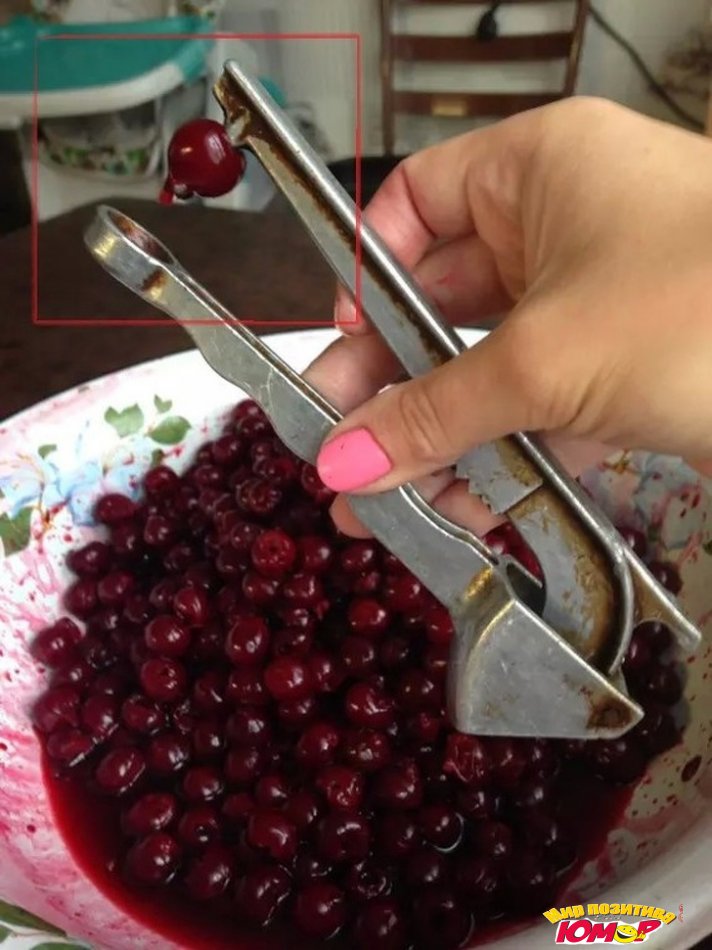Это не только пресс для чеснока, но и устройство для удаления косточек из вишни. В углубление, расположенное на конце ручки, вкладывается ягода, и при нажатии на ручку штырь на противоположной стороне выдавливает косточку.