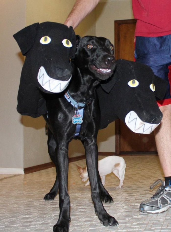 В преддверии Хэллоуина особо упоротые хозяева собак выбирают костюмы и своим питомцам. Фантазии большинства из них хватает на маску с 2 мордами, превращающую животных в трехголового пса типа Цербера.