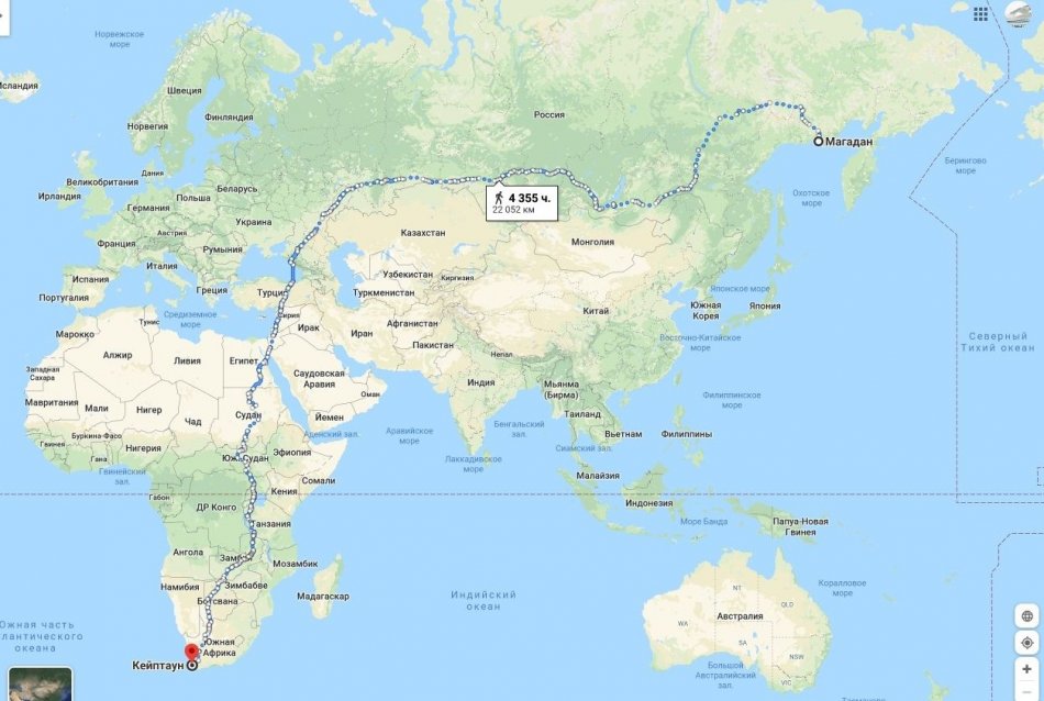 Самая длинная дорога в мире, по которой можно пройти пешком, — из Кейптауна (Южная Африка) в Магадан (Россия). Нет необходимости в самолетах или лодках, есть мосты. Это 22 387 километров (13 911 миль), и путешествие занимает 4 492 часа. Это будет 187 дней ходьбы без остановок или 561 день ходьбы по 8 часов в день. По маршруту вы проходите через 17 стран, шесть часовых поясов и все времена года.