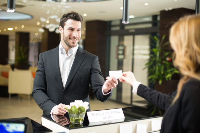 Лучше записать свое имя, номер телефона и любые другие необходимые данные на листе бумаги и передать ее персоналу отеля, чтобы эту информацию нельзя было услышать. Попросите служащих написать номер вашей комнаты, а не произносить его вслух.