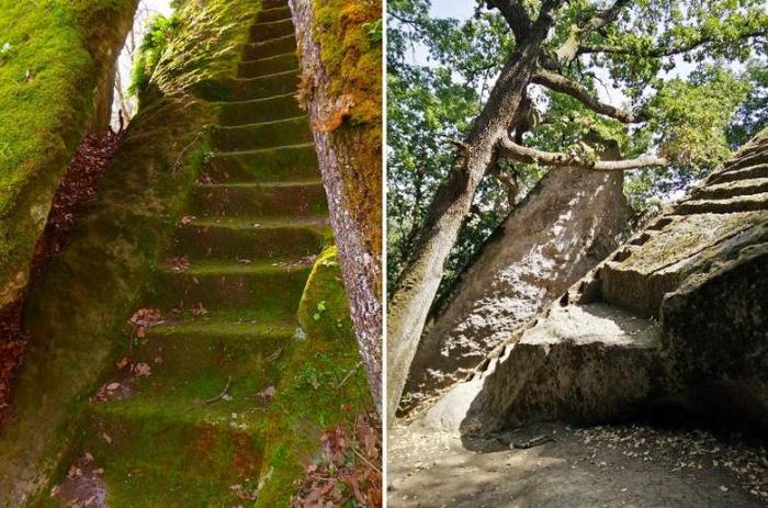 Одна из самых древних необычных лесных лестниц это этрусская пирамида Бомарцо. Это сооружение непонятного предназначения сразу с несколькими высеченными в камне ступенями с разных сторон. Предположительно дата его строительства 700-400 годы до нашей эры и для какой цели было возведено это отдаленное сооружение сказать сейчас уже невозможно. Ученые предполагают, что скорее всего это был жертвенный алтарь. Чтобы найти этот "алтарь", надо долго идти по лесу Бомарцо, так что вероятно это было тайное место не для всех. И именно поэтому обнаружили это сооружение совсем недавно в 1991 году, а исследовать начали лишь с 2008 года. Любопытно, что хотя этот комплекс лестниц отнесли к цивилизации этрусков, больше всего он напоминает продукт культуры ...майя. Также хоть его официальное название "Пирамида", этот объект не пирамидальной формы. Неизвестные мастера очень ровно обтесали края огромного мегалита и прорубили в его сторонах ступени.