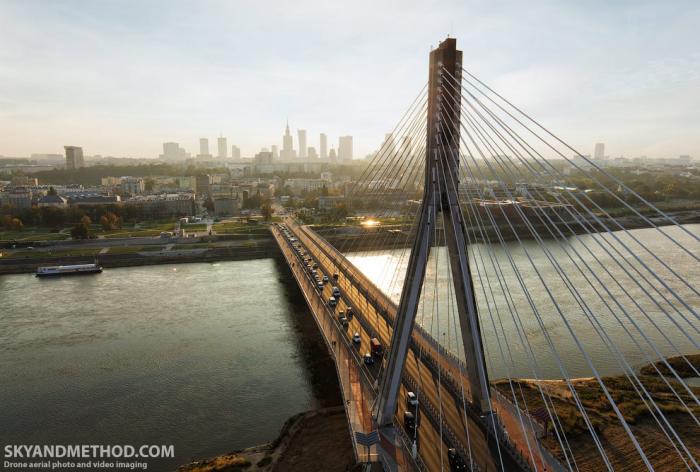 Времени у нас было не так много, успели сделать один хороший кадр, и погнали в сторону Вислы. Всего в Варшаве 11 мостов. На снимке самый современный — Свентокшиский мост.
