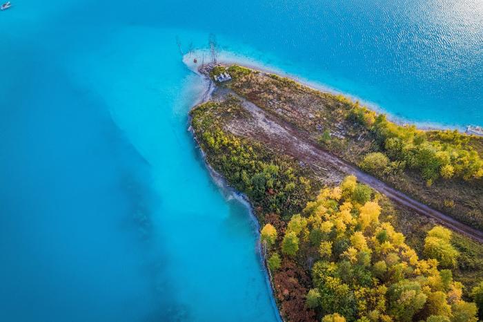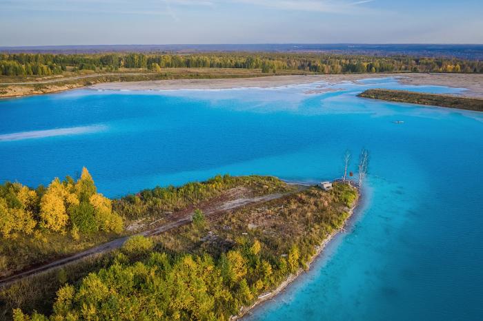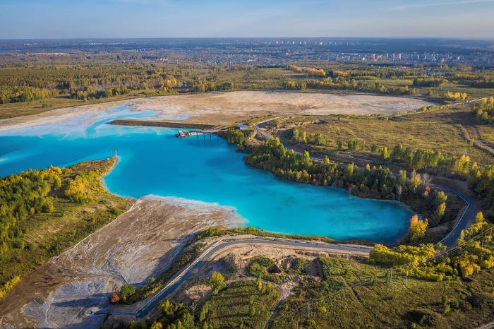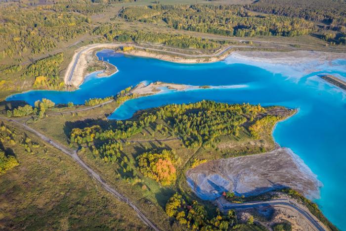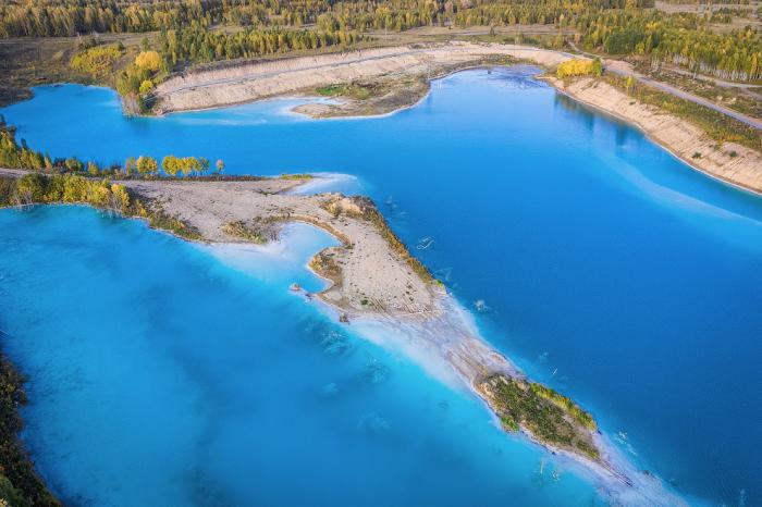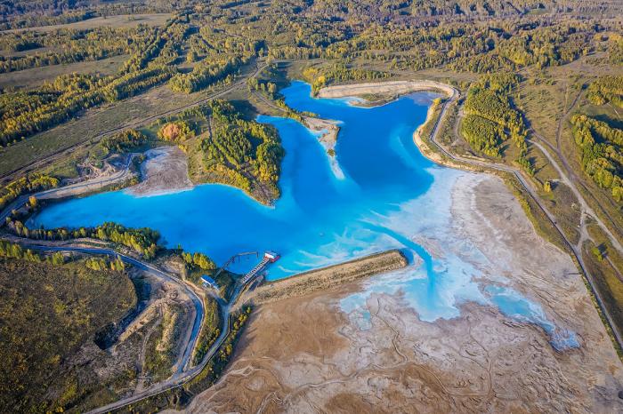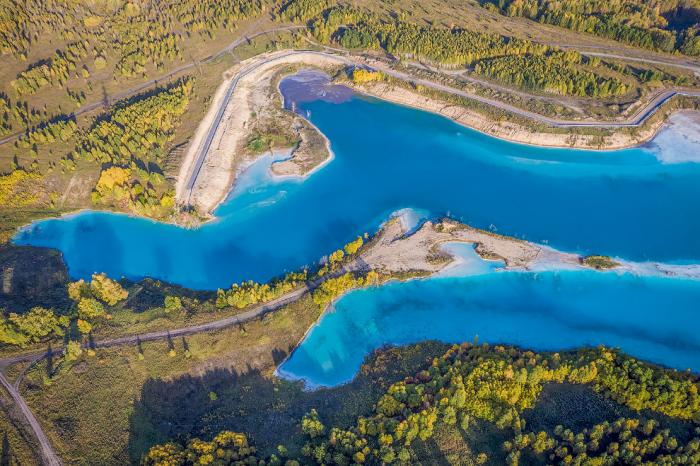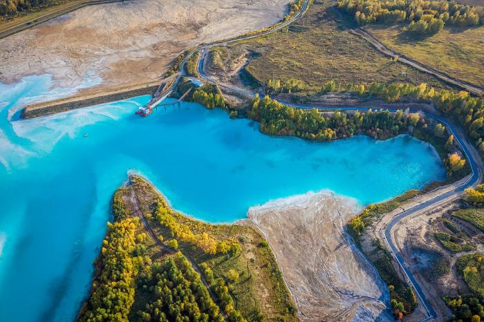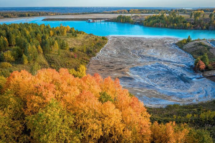 Среди осенней листвы, очень колоритно смотрится золоотвал. А цвет воды напоминает о Мальдивах. Только это сибирские Мальдивы.