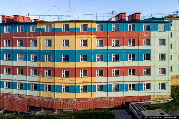 Большинство домов — цветные. Раскрашивать их стали при прошлом губернаторе, Романе Абрамовиче. Проект городской среды разработала дизайн-студия «Ё-программа». Они убедили губернатора, что это поможет горожанам позитивнее воспринимать окружающую действительность.