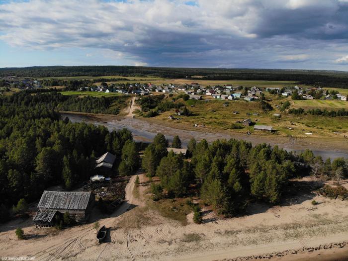 Это поморское село Пурнема, где сохранилась старинная деревянная шатровая церковь и «кладбище карбасов» на берегу Белого моря.