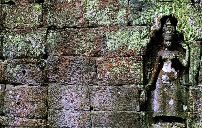 Толстые корни оплетают стену подобно щупальцам осьминога. Ради этих видов туристы стремятся посетить Та Пром, хотя по сравнению с Ангкор Ваттом народу значительно меньше, ранним утром или после обеда можно побродить совсем в одиночестве: