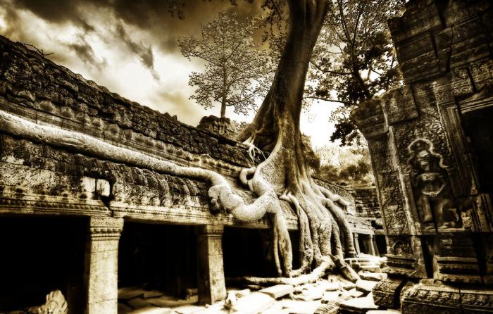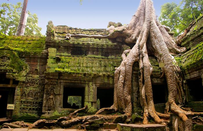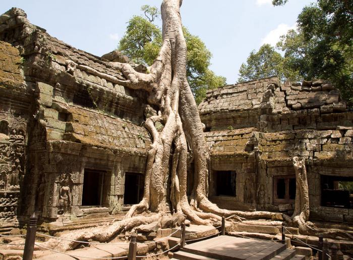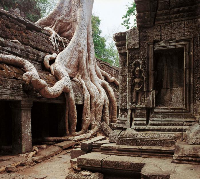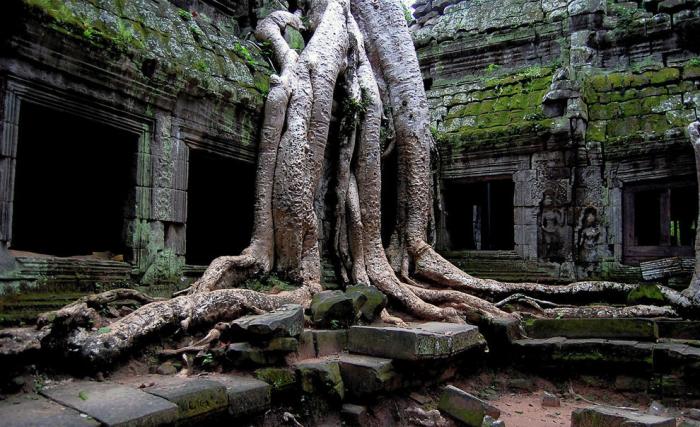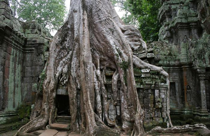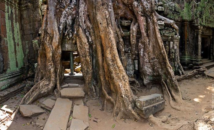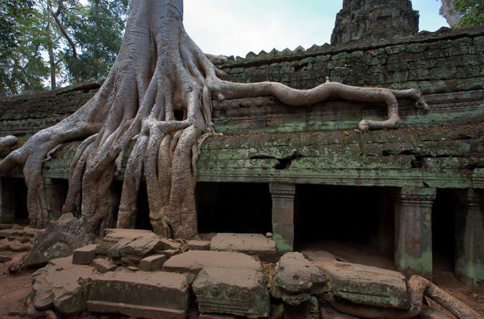 Корни и храмовая стена слились и образовали единое целое. Дерево буквально вросло в каменную кладку и если попытаться спилить его, то уже сама каменная конструкция не выдержит и распадется на блоки. Природа берет верх над человеком, и без постоянной поддержки храм будет все большое утрачивать первоначальный облик: