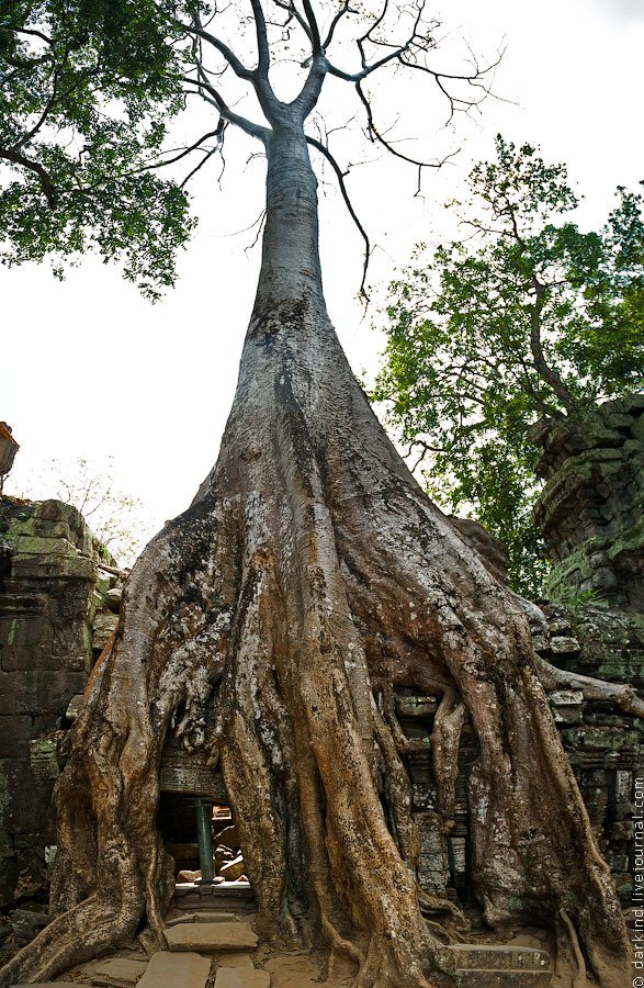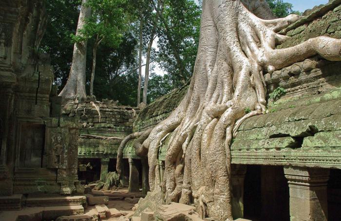 Особняком здесь находится храм Та Пром (Ta Prohm), где огромные деревья, напоминающие вековые секвойи или дубы, сливаются со стенами и башнями и обнимают камни гигантскими корнями.