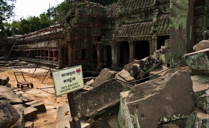 Многие блоки пронумерованы, один мой друг рассказал мне, что в середине двадцатого века была проведена большая работа по реставрации и сохранению храмов. Ученые из многих стран, в большей степени из Франции и Японии, разбирали храмы по блокам, нумеровали их, делали схемы и потом собирали снова, как конструктор лего по инструкции. Звучит странновато, т.к. не могли же они разобрать башню в которую вросло дерево, но, тем не менее, номера присутствуют: