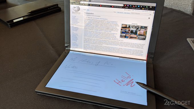 Показанный журналистам гаджет оснащён 13.3-дюймовым гибким сенсорным OLED-дисплеем с разрешением 2K (1920 x 1440 точек, соотношение сторон в развёрнутом виде 3:2) от компании LG. При сгибании экрана получаются две части, каждая с диагональю 9.6-дюйма. При этом устройству доступны разные сценарии эксплуатации. Пользователь сможет использовать изделие в формате ноутбука, планшета, книги или даже миниатюрного моноблока на ОС Windows 10.