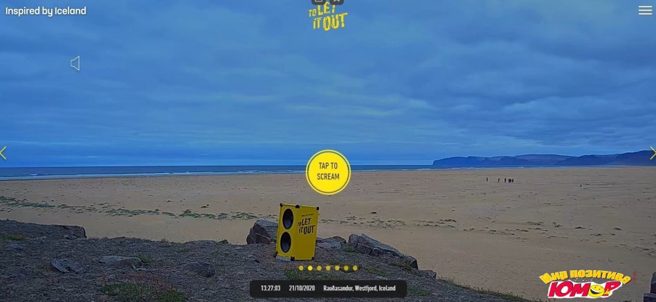 В разных уголках Исландии стоят несколько жёлтых колонок, транслирующих крики, которые записывают люди со всего мира. Нажимайте жёлтую кнопку и кричите на Исландию что есть мочи. Если почту укажете, то вам должны прислать запись, на которой ваш крик разносится по исландским просторам.