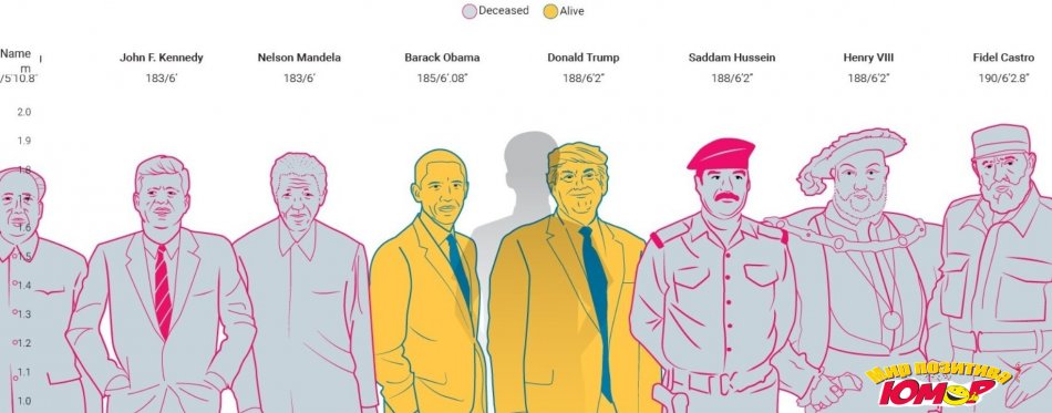 Указывайте свой рост в сантиметрах или в футах и смотрите, с кем из политиков настоящего и прошлого вы одного роста. Самый маленький в ряду правителей - Дэн Сяопин (152 см), самый высокий - Уильям Уоллес (198 см).