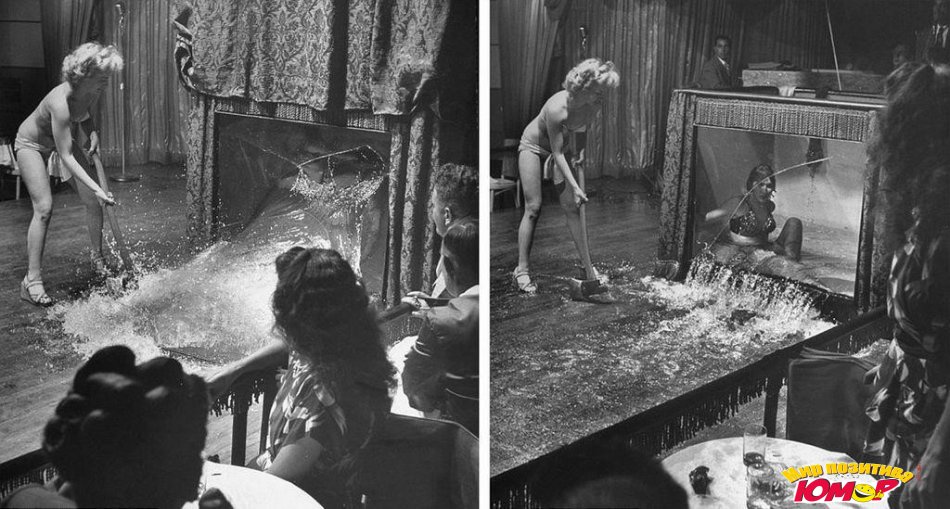 С первого взгляда, на фото изображен какой-то старинный трюк, в котором что-то пошло не так и исполнительницу пришлось спасать из аквариума. На самом деле женщина с топором - Китти Вест (также известная как "Эванджелин девочка-устрица"), которая разбила стеклянную коробку в порыве ярости. Исполнительница бурлеска в Новом Орлеане в конце 1940-х годов поссорилась с девушкой, которая демонстрировала подводный стриптиз в гигантском "стакане", заполненном водой. Во время выступления Китти и разбила инвентарь своей соперницы, после чего начала драку.