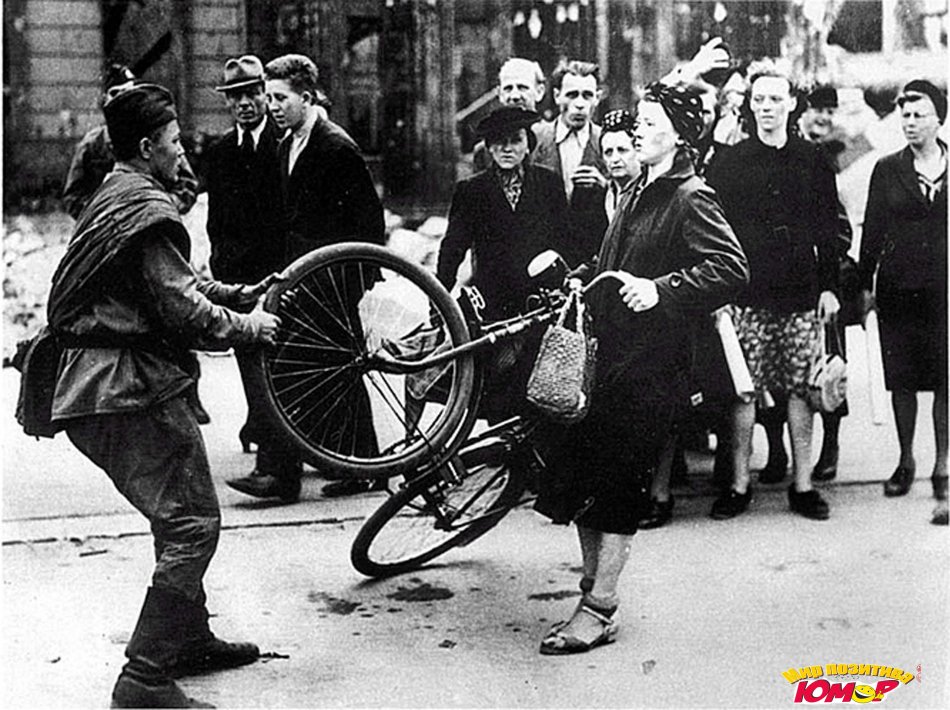 Это фото часто можно видеть с подписью "Советский солдат отбирает велосипед у немки"