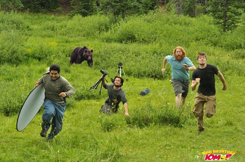 Журналисты убегают от медведя - подделка, медведя взяли с другой фотографии и прифотошопили