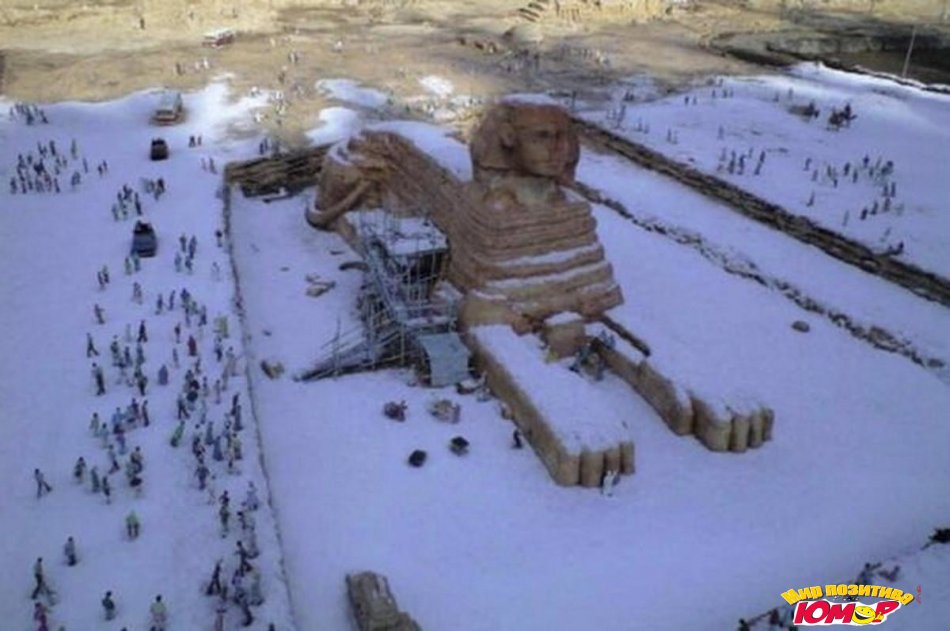 Легенда к этой фотографии гласит, что якобы на ней запечатлён сфинкс, покрытый слоем снега в результате первого за 112 лет снегопада в Каире. На самом деле, фото вообще не имеет никакого отношения к Египту, поскольку было сделано в японском тематиче