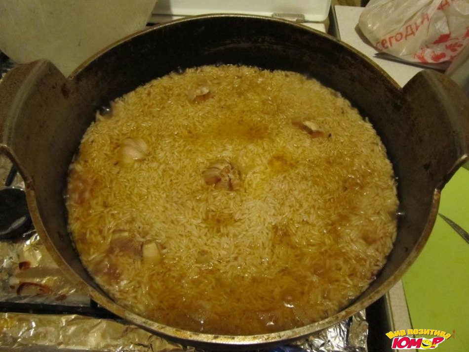 Можно отодвинуть шумовкой сбоку и посмотреть выкипела вода или нет, — должно остаться только масло.Если вода выкипела, собираем рис горкой, убираем огонь до минимума и закрываем крышкой.