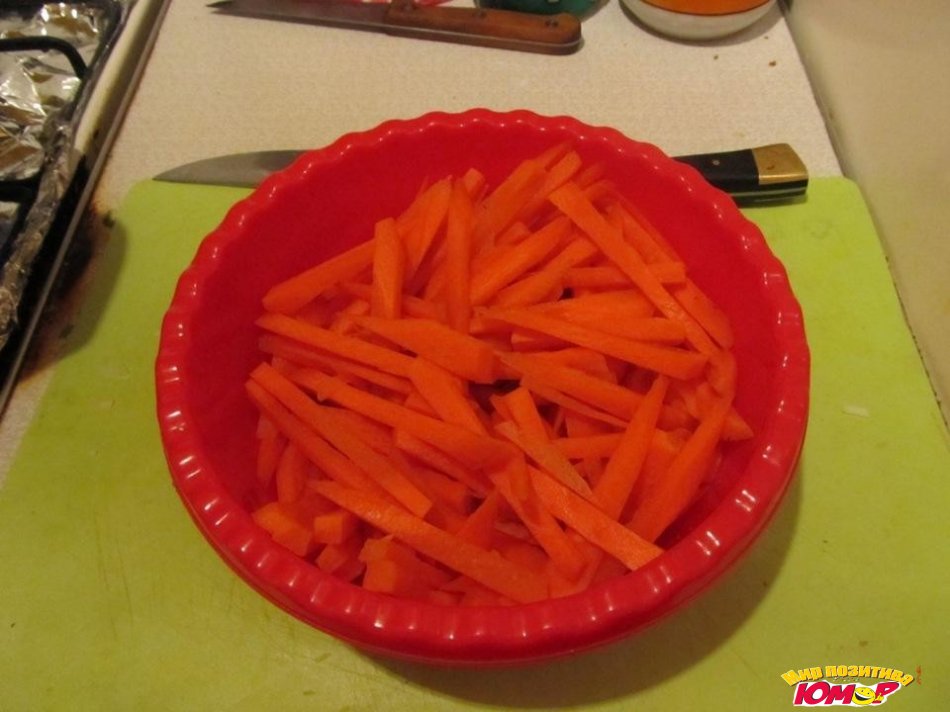 Для начала порежем ножом (не натрем на терке, не порубим в комбайне) морковь соломкой. Морковь — душа узбекского плова!