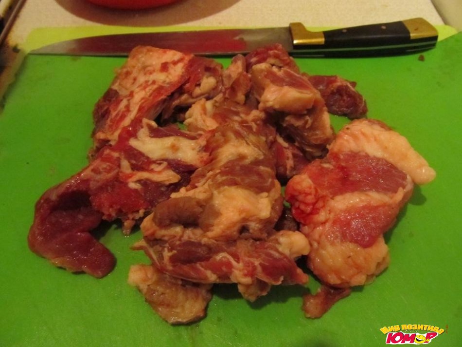 Подготовим мясо, порежем кубиками. Некоторые мясо режут большими кусками, а потом после приготовления мясо режут, ну это как кому нравится.