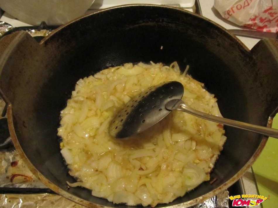 Если готовим на масле, то масло прокаливаем до легкого дымка (не до приезда пожарных!), и опускаем в него целую луковицу, выжариваем ее до темного цвета, и вытаскиваем-выбрасываем. Луковица придаст красивый цвет и придаст аромат маслу. Огонь на максимуме! Затем, засыпаем порезанный лук.