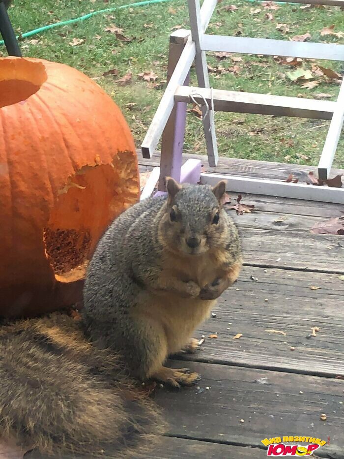 Белка по кличке Сэди сделала три хллоуинских светильника из тыкв, буквально не щадя живота своего